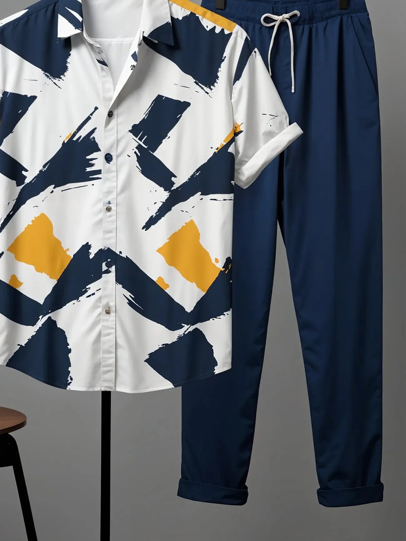 Add a bold artistic edge to your wardrobe with this Korean-style co-ord set, featuring a dynamic brushstroke print shirt in navy, mustard, and white. Inspired by abstract street art, the shirt delivers a fresh, modern vibe that stands out effortlessly. Paired with matching navy trousers featuring a relaxed drawstring fit, this set offers unbeatable comfort with head-turning style.