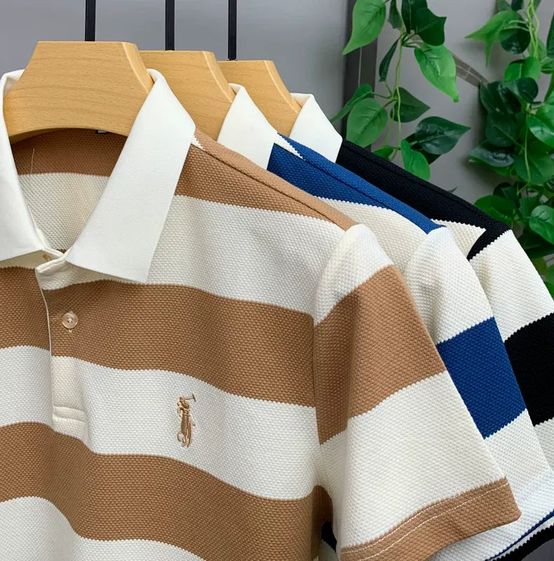 Classic Striped Polo T-Shirt in Cream & Blue – Premium Texture with Iconic Embroidered Horseman Logo