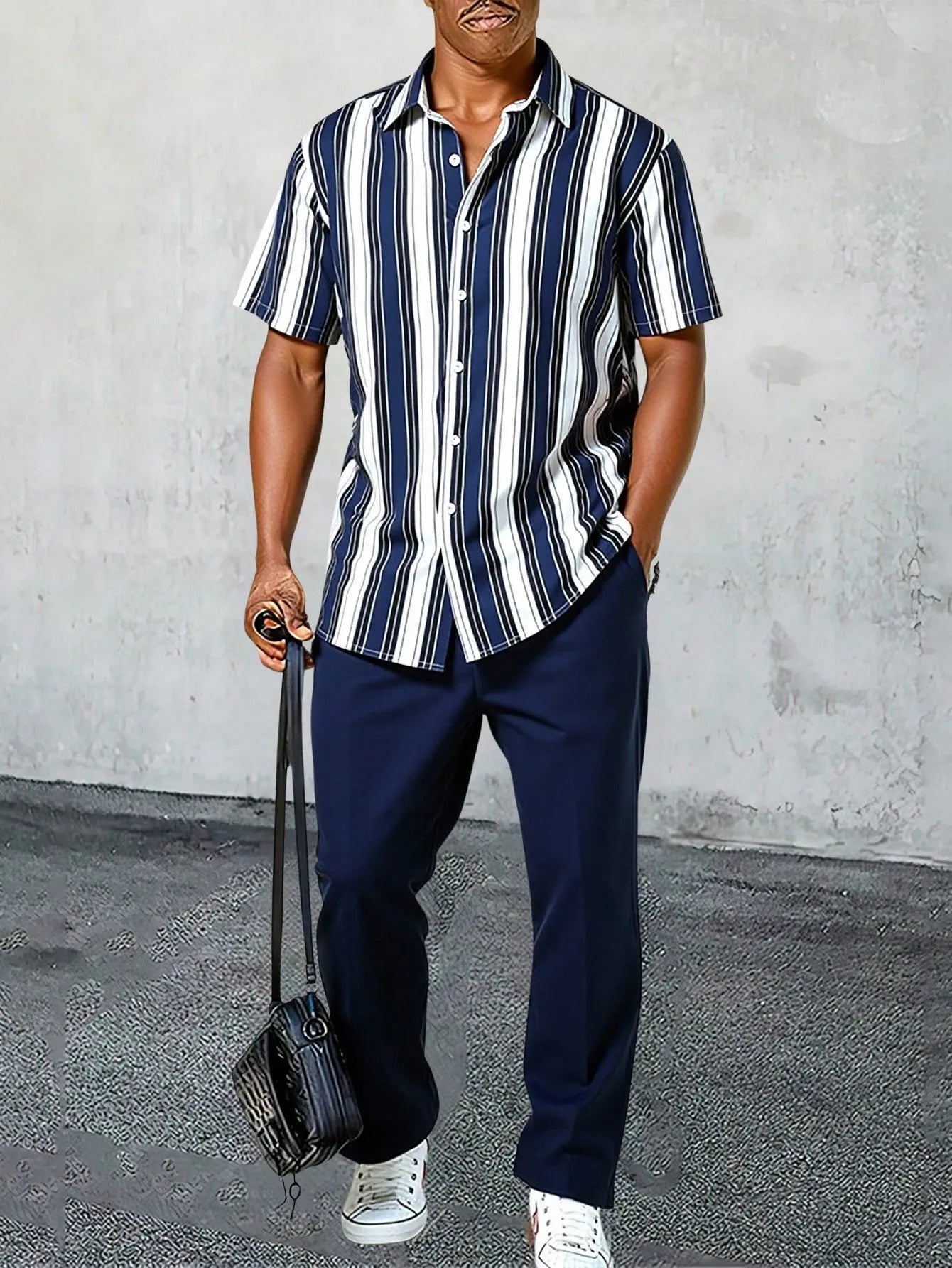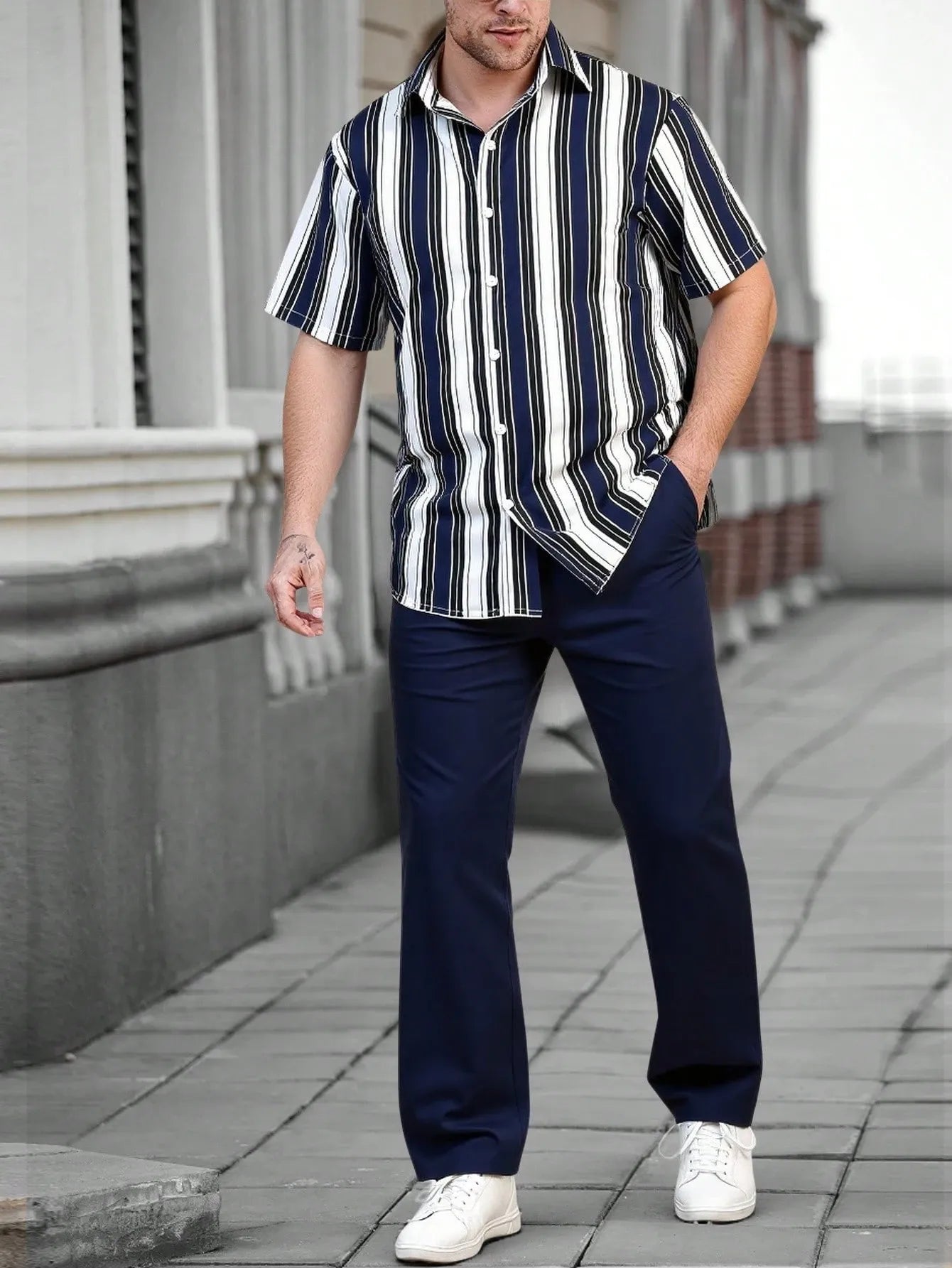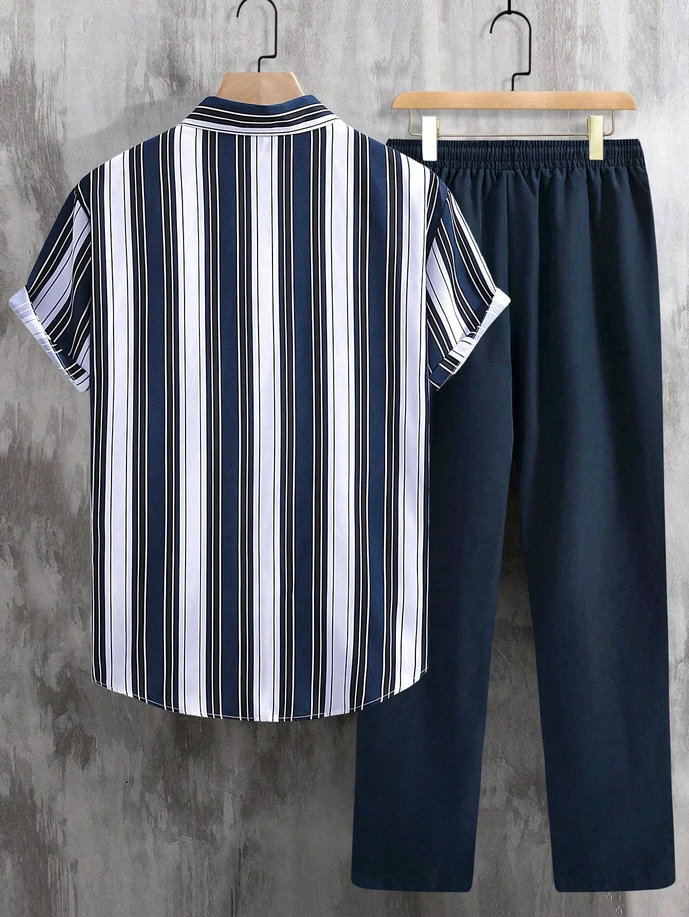 Refined yet relaxed, this Korean-style co-ord set is a go-to choice for smart casual dressing. The shirt features vertical navy, white, and black stripes that elongate your frame while offering a clean, modern aesthetic. Crafted from soft, breathable cotton, it pairs seamlessly with the solid navy trousers designed for all-day comfort and a polished look.