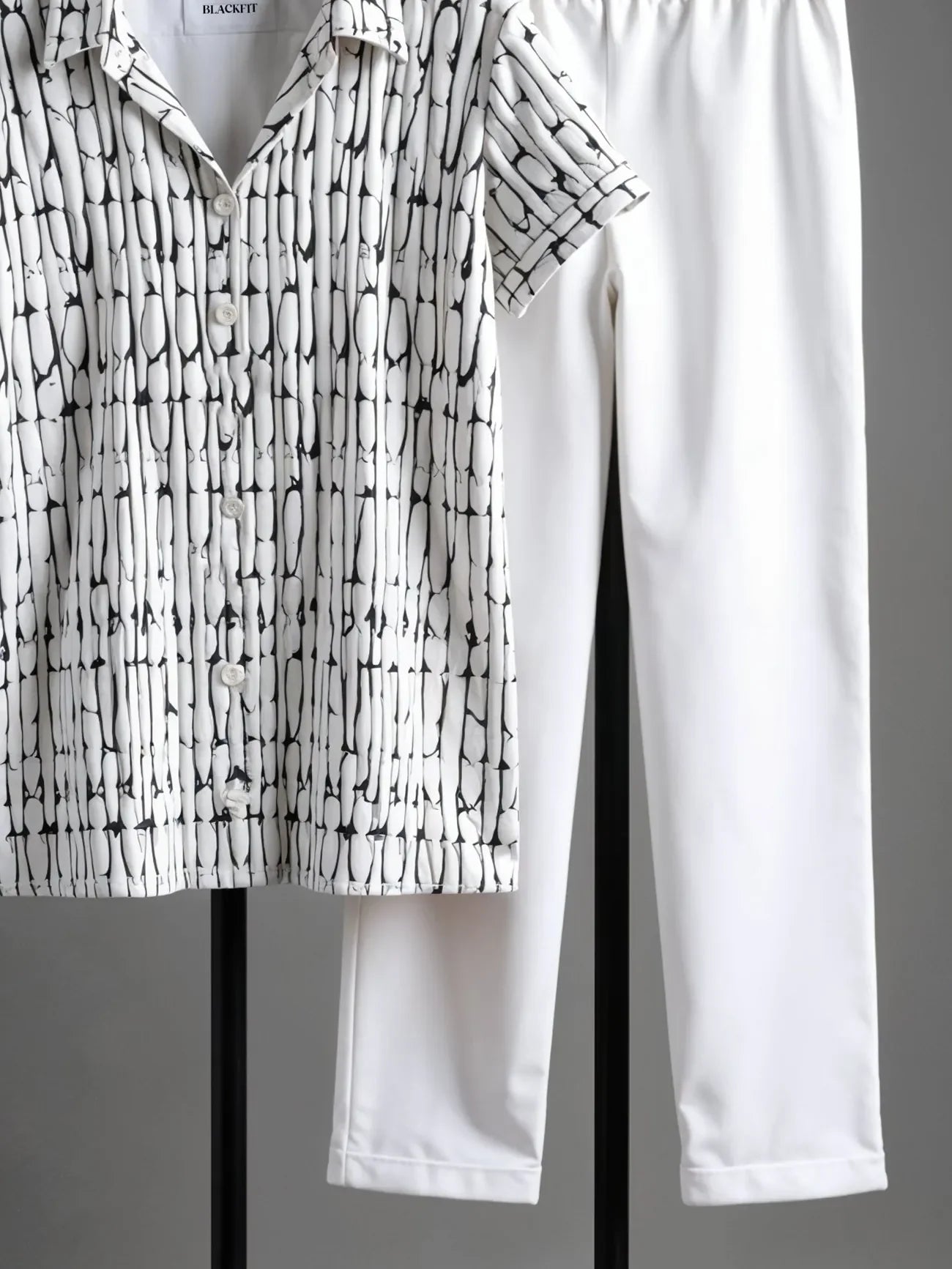 Make a sharp, modern statement with this Korean-style co-ord set, featuring a bold abstract black-and-white shirt paired with sleek white trousers. The shirt’s eye-catching monochrome pattern brings a touch of artistic edge, while the soft cotton fabric ensures breathability and comfort. The solid white trousers balance the look with a crisp, minimalist finish – perfect for those who appreciate standout style with effortless wearability.