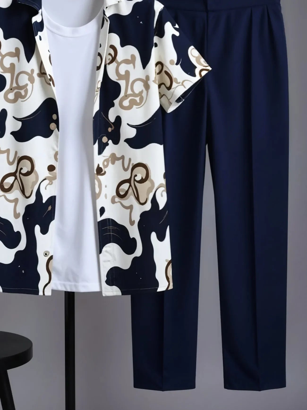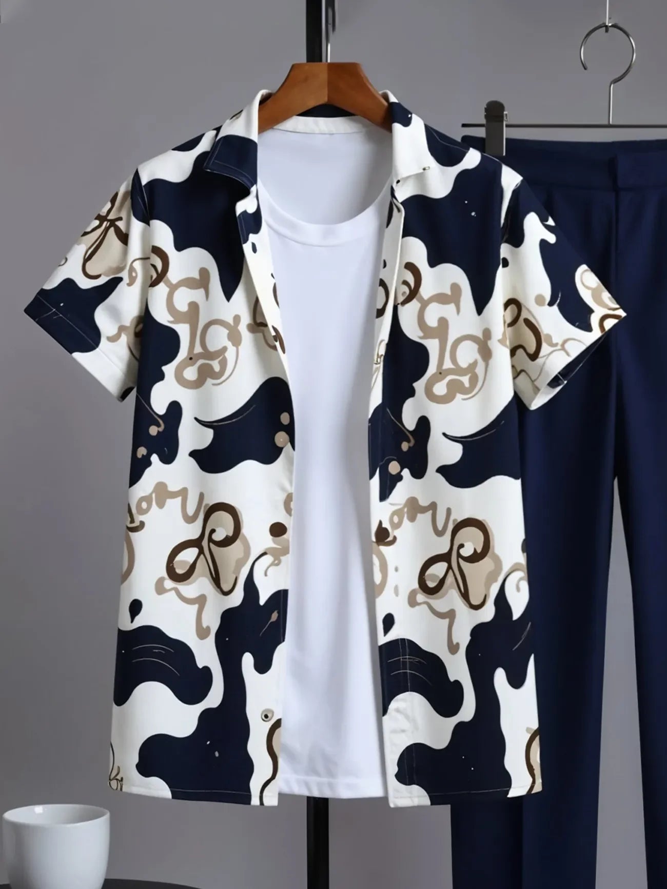 Make a bold entrance with this contemporary Korean-style co-ord set featuring an abstract printed shirt in navy, cream, and tan tones. Crafted from breathable, lightweight cotton, the shirt’s artistic design adds a creative edge to your wardrobe. Paired with tailored navy trousers in a soft cotton blend, this set strikes the perfect balance between standout style and everyday comfort.
