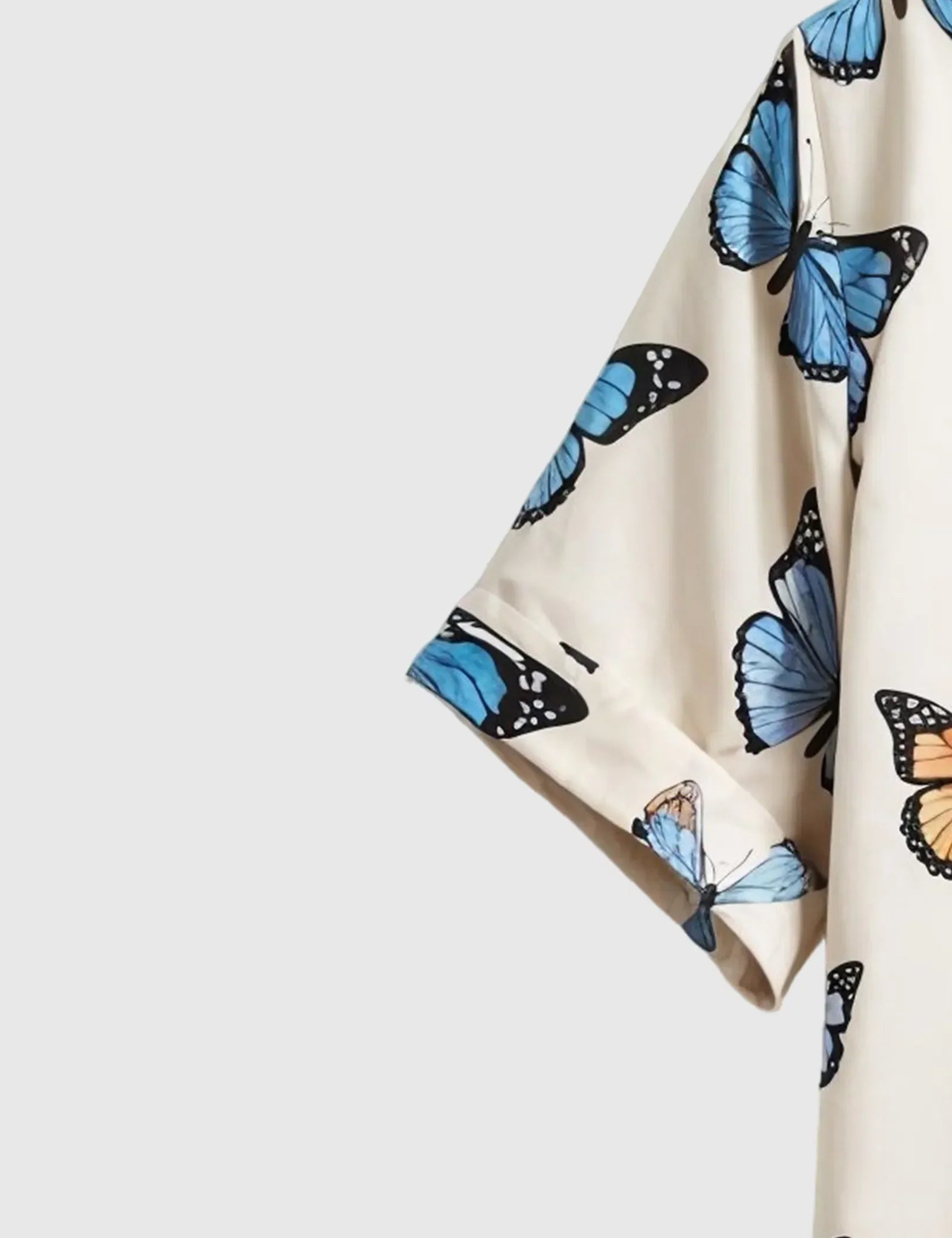 Men's Casual Short Sleeve Button-Up Shirt with Blue & Orange Butterfly Print