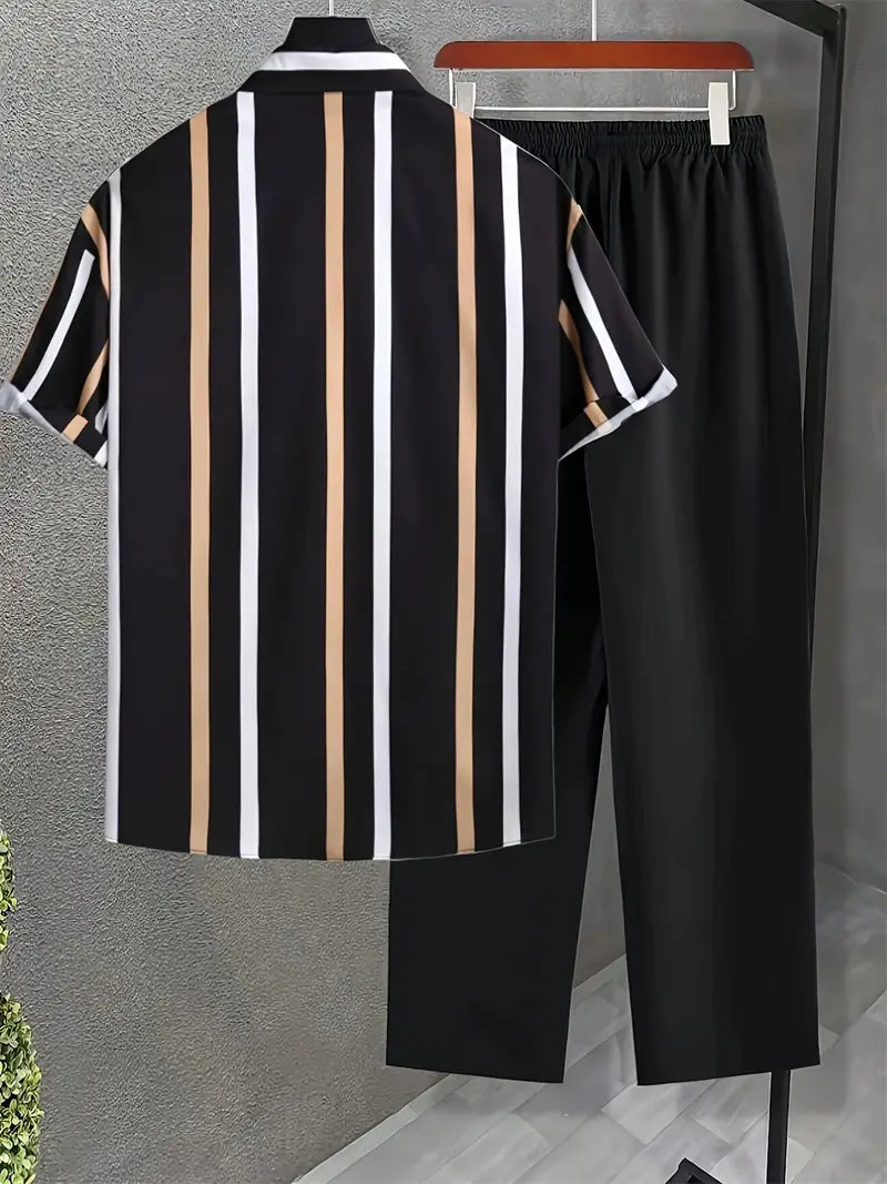 Turn heads with this effortlessly cool Korean-style co-ord set, featuring a vertical striped shirt in tan, white, and black tones – a timeless palette that speaks minimal sophistication. Crafted from soft, breathable cotton, the shirt delivers a relaxed yet polished look perfect for both day and night. Paired with solid black cotton trousers that offer a clean silhouette and all-day comfort, this set redefines casualwear with a fashion-forward twist.